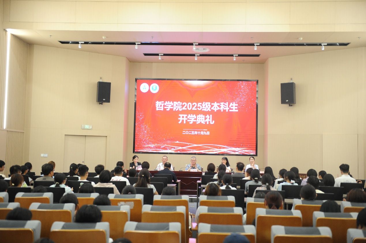 (学生通讯员:顾秋婕/摄影:孟才雅、张烨)金秋送爽迎丹桂,哲院纳新聚英才。10月9日14时30分,哲学院2025级本科生开学典礼暨院徽院训发布仪式,于法科大楼小报告厅隆重举行。哲学院院长王雨辰、院党委书记刘琳琳、副院长朱松峰、副院长张佳、院党委副书记胡盈,各系负责人、教师代表、学生工作办公室全体成员及2025级全体本科生出席。本次活动由胡盈主持。