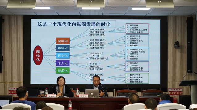 讲座伊始,庞教授以"这是一个怎样的时代"之问展开论述,精辟指出我们正处在一个现代化向纵深发展、多元价值观念复合叠加、政治思潮冲突对抗的大变局时代。在这个时代背景下,各国分享相同的时代背景,国与国之间的关系前所未有的紧密,任何一个国家实力、地位和影响力的变化都会引起一系列连锁反应。