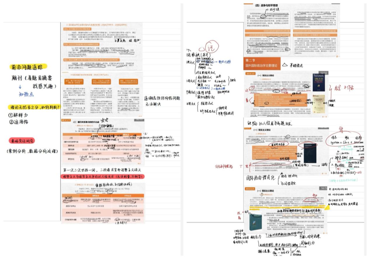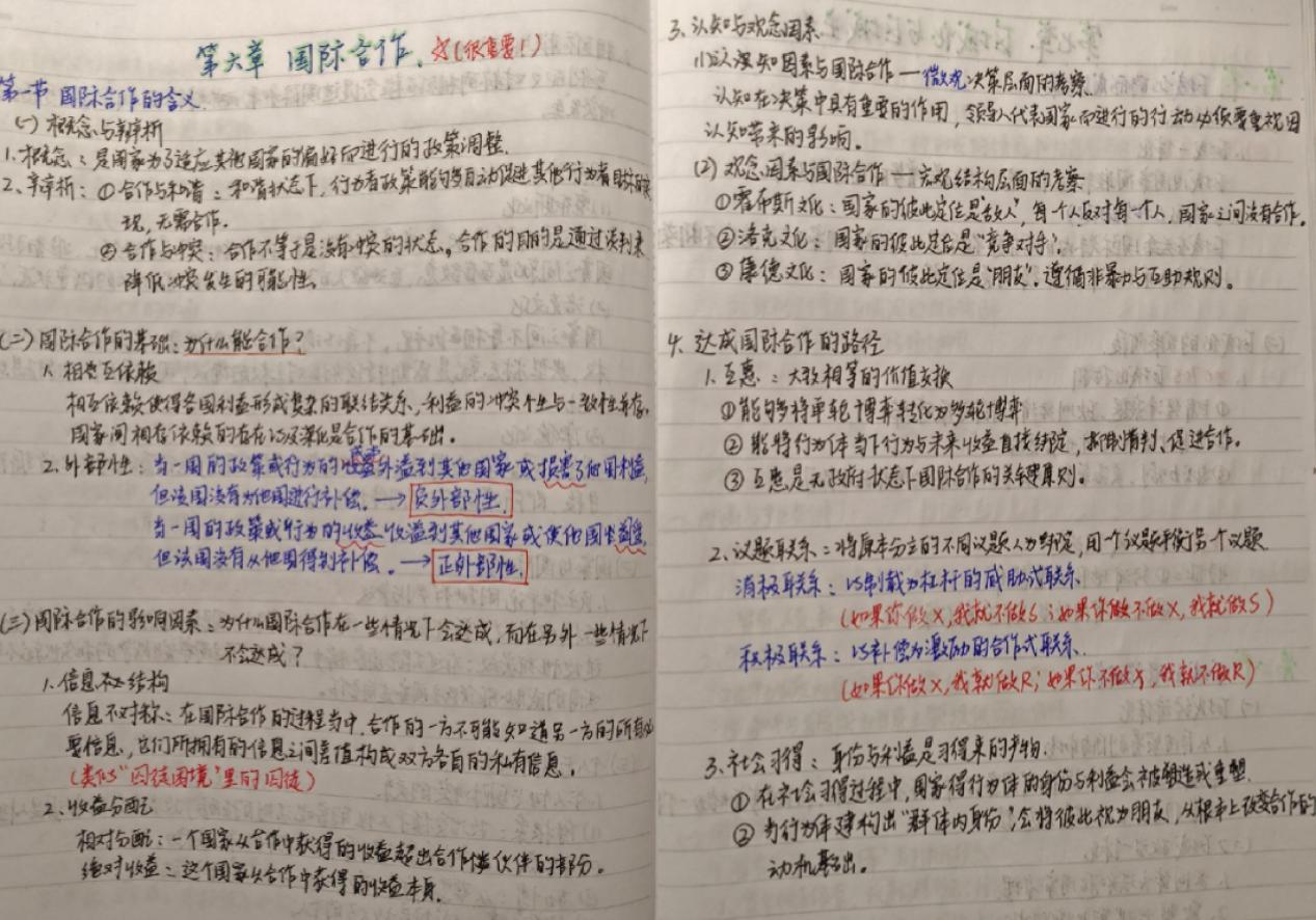 方丽媛同学的《国际政治学概论》则是书写工整,内容归纳明确,版式设计合理,色彩搭配恰当,重点标注突出。
