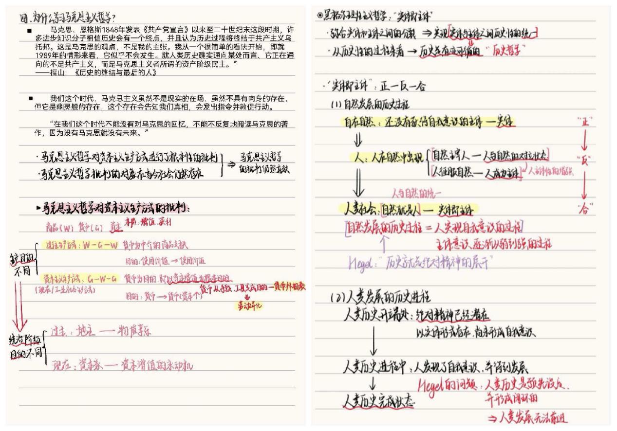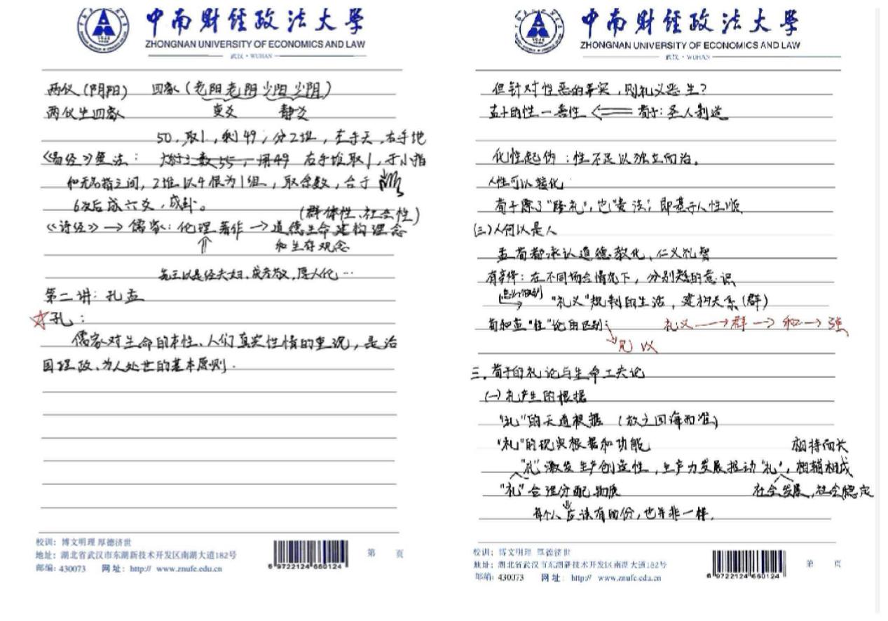此外,哲学2401石玉玺《马克思主义哲学史》、国政2401杨丹《法理学》、哲学2301张烨《马克思主义哲学中国化》、PPE2401潘柳任《会计学》、哲学2501臧璇《中国传统哲学的生命智慧》获得优秀奖。他们的笔记同样亮点频出,有的相关内容补充丰富,有的使用详细的流程图和思维导图梳理知识,有的通过形象的手绘图帮助理解,充分展现了同学们积极向上的学习态度和求索精神。