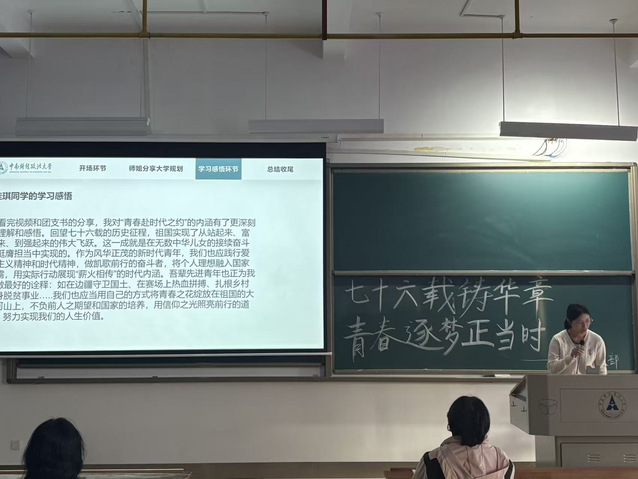 在学习感悟环节,团支书张静静围绕“七十六载发展历程与当代大学生的青春担当”的主题发言,号召同学们将个人梦融入中国梦,以实干诠释青春价值。随后,易佳琪、李帆和万秀鑫同学主动分享学习感悟,结合自身成长经历畅谈对责任、理想与奋斗的理解,表达了坚定信念、砥砺前行的决心。