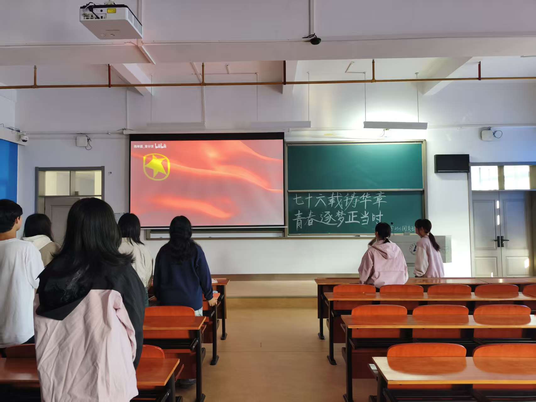 活动在庄严的团歌声中拉开帷幕。主持人罗钰洁首先介绍了本次活动的主题与背景,强调了七十六年来国家发展的辉煌成就与青年使命的紧密联系。随后,全体同学共同观看了反映中国共产党领导全国各族人民奋斗历程的相关视频,重温那段波澜壮阔的峥嵘岁月。
