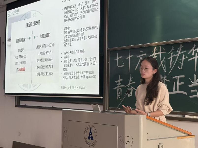 为增强活动实效性,本次团日特别邀请了优秀师姐王婧巧,围绕“大学四年规划与个人成长路径”进行经验分享。师姐结合自身学习与实践经历,从学业目标、科研实践、职业发展等方面提出建议,鼓励同学们尽早明确方向、珍惜时光、主动作为,将个人成长自觉融入时代发展大局。分享内容贴近实际、启发性强,为同学们合理规划大学生活提供了参考。