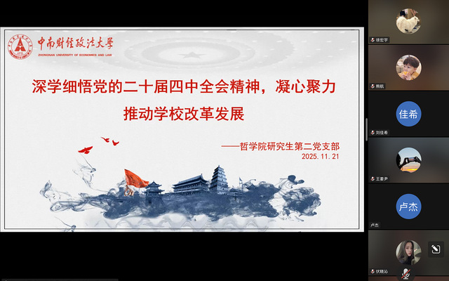 (通讯员 周熹)11月21日下午,哲学院研究生第二党支部在腾讯会议平台开展“深学细悟党的二十届四中全会精神凝心聚力推动学校改革发展”主题党日活动。会议由研究生第二党支部组织委员刘静同志主持,支部全体党员参加会议。