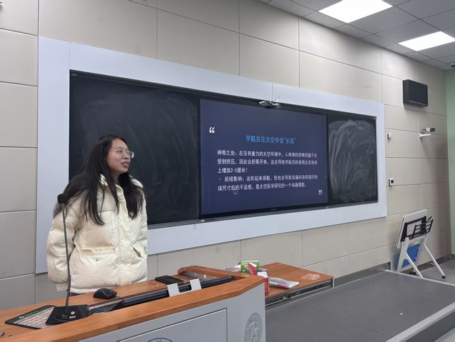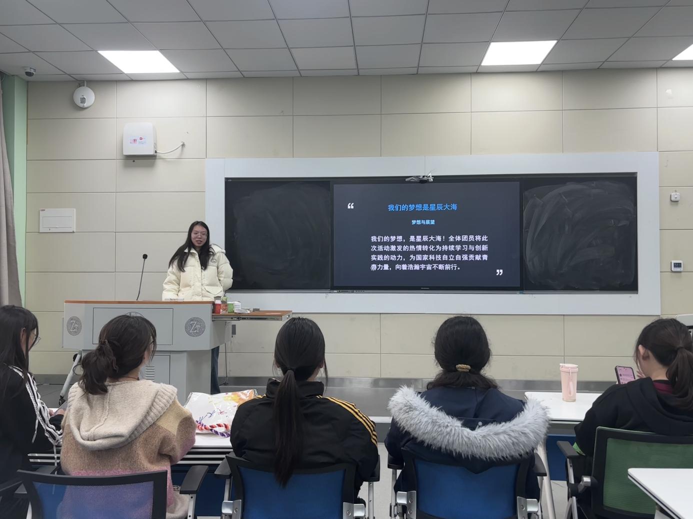 活动伊始,彭雅婷向同学们介绍了本次团日活动的主题、背景与目的,重点讲解了神舟二十一号载人飞船的发射盛况。彭雅婷表示,这一里程碑式的成就彰显了我国的科技实力,希望通过本次活动,同学们在学习航天知识、传承航天精神中坚定信念、激发斗志,以青春之姿奔赴星辰大海。