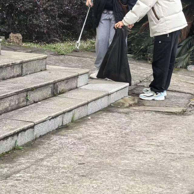 时间在夹子中、垃圾袋上悄然飞过,两小时匆匆而过。有人挥动扫帚,清理路面上的落叶;有人手持夹子,仔细捡拾绿化带中的杂物;还有人针对卫生死角展开重点整治。经过近两个小时共同努力,文添楼周边区域面貌一新——路面干净整洁,绿植间不见垃圾踪影,整体环境得到显著改善。