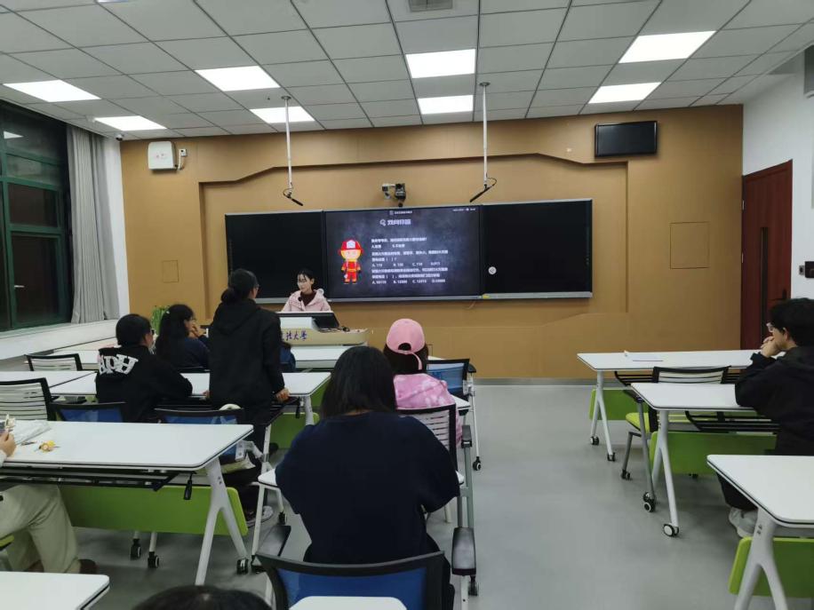 在防火安全教育环节,团支书张静静以2017年浙江天台足浴中心重大火灾事故为例,讲解了引发火灾的原因:电热膜故障引发局部过热,引燃可燃物导致悲剧发生。通过八大火灾成因的讲解(如违规用电、乱扔烟头、设备老化等),同学们深刻认识到“隐患险于明火,防范胜于救灾”的重要性。
