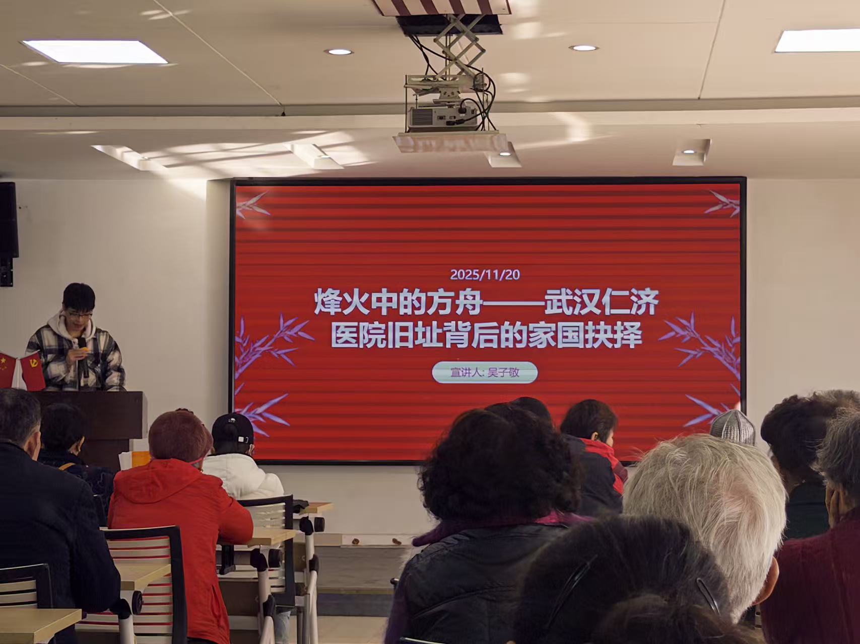 (学生通讯员:李思瑶)为鼓励基层党员学习武汉红色故事并增强对其党的向心力,11月20日,哲学院组织志愿者赴武昌区粮道街街道花园山社区开展“花园讲堂”第八期活动,学生党员吴子敬为社区讲授“烽火中的方舟——武汉仁济医院旧址背后的家国抉择”专题党课。
