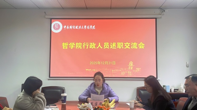 (通讯员陈春英张媛)12月31日下午,哲学院首次召开行政人员述职交流会。临近年终岁尾,依据《中南财经政法大学教职工年度考核办法》,为更好地完善学院考核评价体系和绩效分配制度,充分调动行政人员工作积极性和主动性,激发激励行政人员紧紧围绕本职岗位,进一步提高履职尽责能力,经学院领导研究,借鉴学校对二级单位考核考评相关好的经验做法,特组织此次行政人员述职交流会。