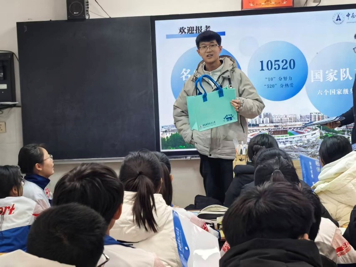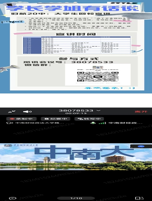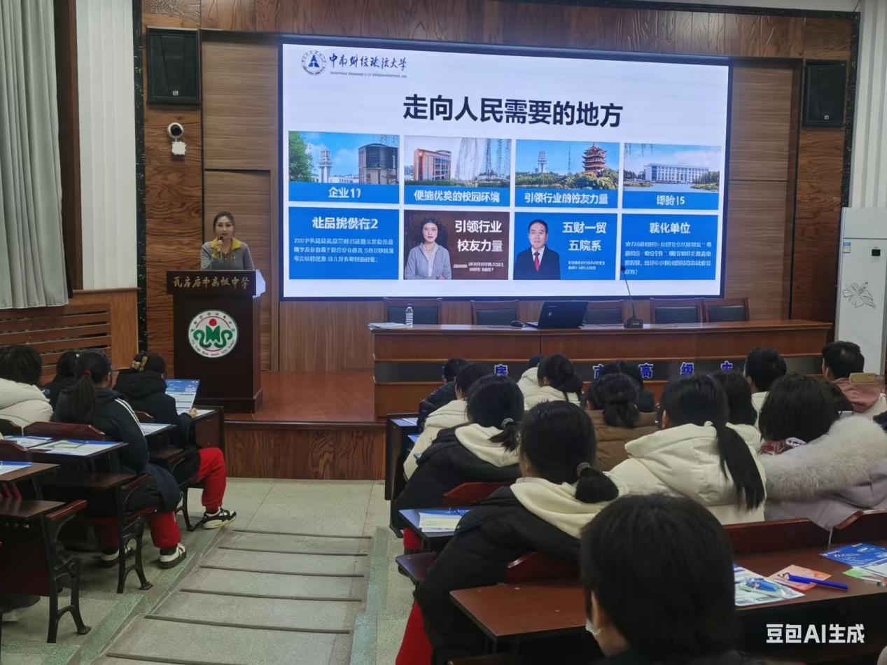 来自国政2501魏家祺利用返乡契机,先后赴沈阳东北中山中学和沈阳市第二十中学两所学校进行招生宣讲,为同学们带来湖北武汉的美丽风光,向学弟学妹们详细分享中南财经政法大学的专业设置、培养方案、校园文化及招生政策等,助力学子升学规划。宣讲后,向现场学生分发明信片、套尺、修正带等融合校园文化元素和实用功能的品类丰富的文创产品。