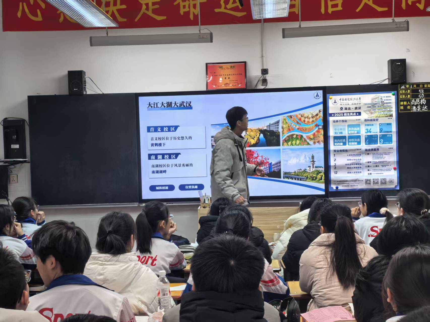 来自ppe2401王陈君、法学院法2510李想积极响应宣讲活动,回到母校吉林省长岭县第三中学,对两个班级百余位学生,从中南大历史底蕴、财经政法深度融通的特色、强大的师资及校友力量、优异的地理位置、便利的交通与丰富的美食等方面展开宣讲,展现了一个令人向往的中南大。