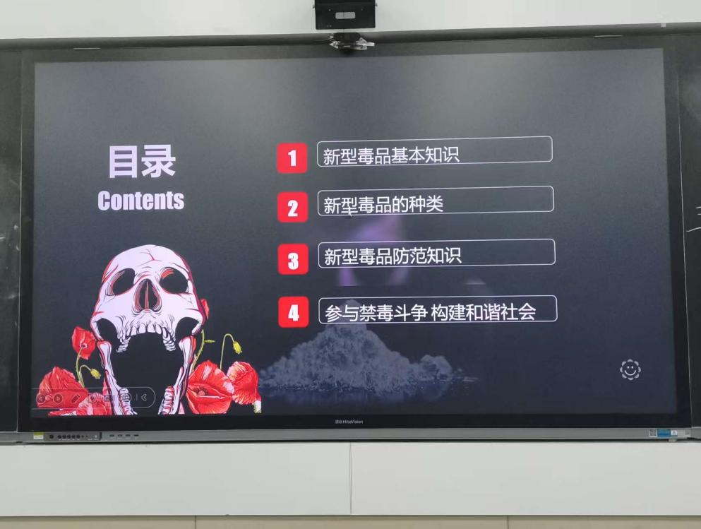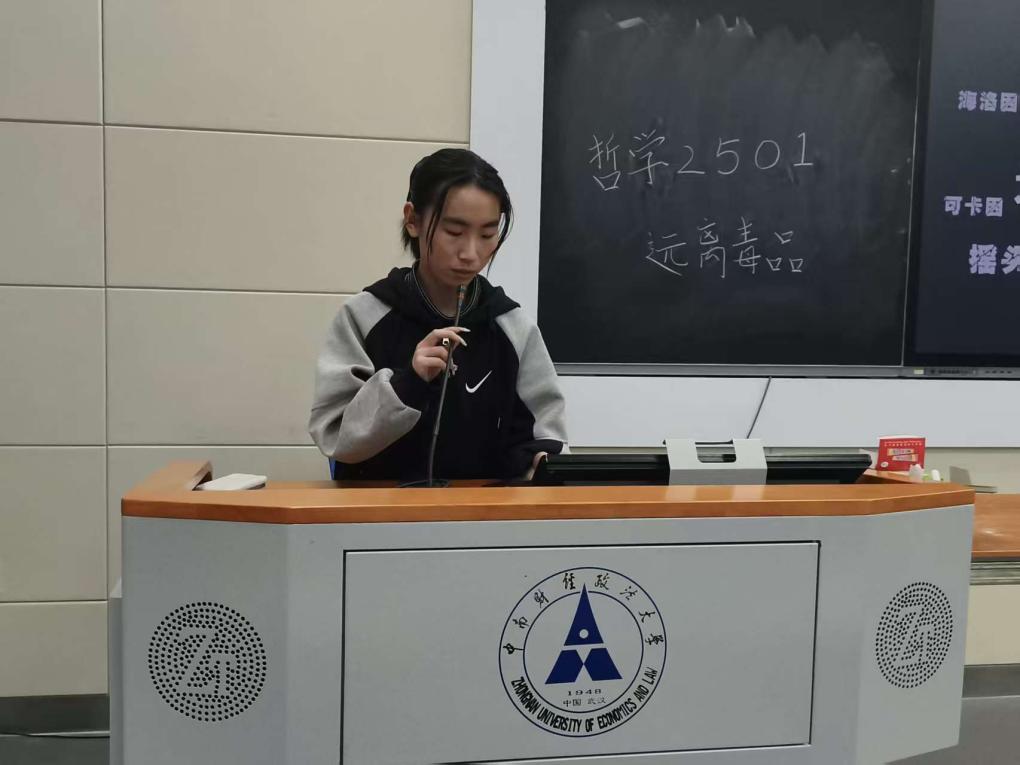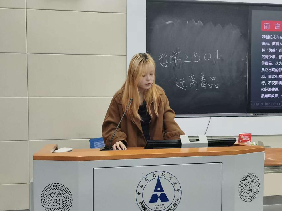 罗钰洁通过PPT展示系统讲解禁毒知识,讲解中穿插真实案例,同学们认真听讲,现场氛围严肃。