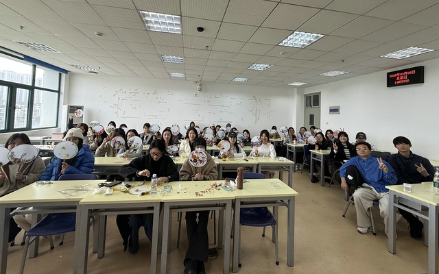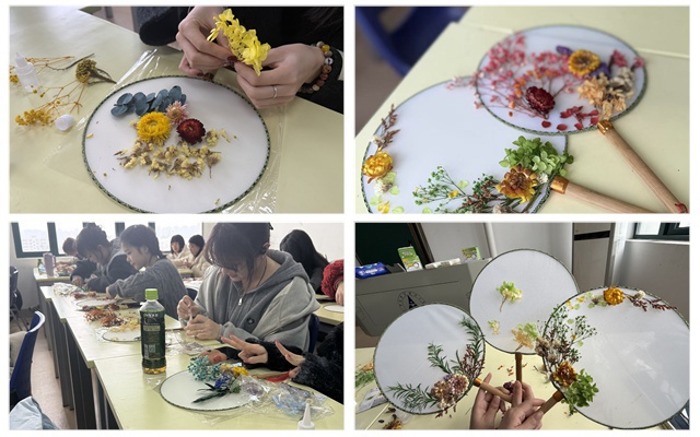 在动手环节,同学们以天然干花为材,精心搭配、巧手勾勒,将春日芬芳定格于扇面。大家沉浸在DIY的乐趣中,互相交流创意、分享心得,现场氛围温馨融洽。一柄柄独具匠心的压花团扇次第成型,诗意与浪漫在指尖缓缓绽放,既展现了传统团扇的风雅韵味,也彰显了同学们的审美与巧思。