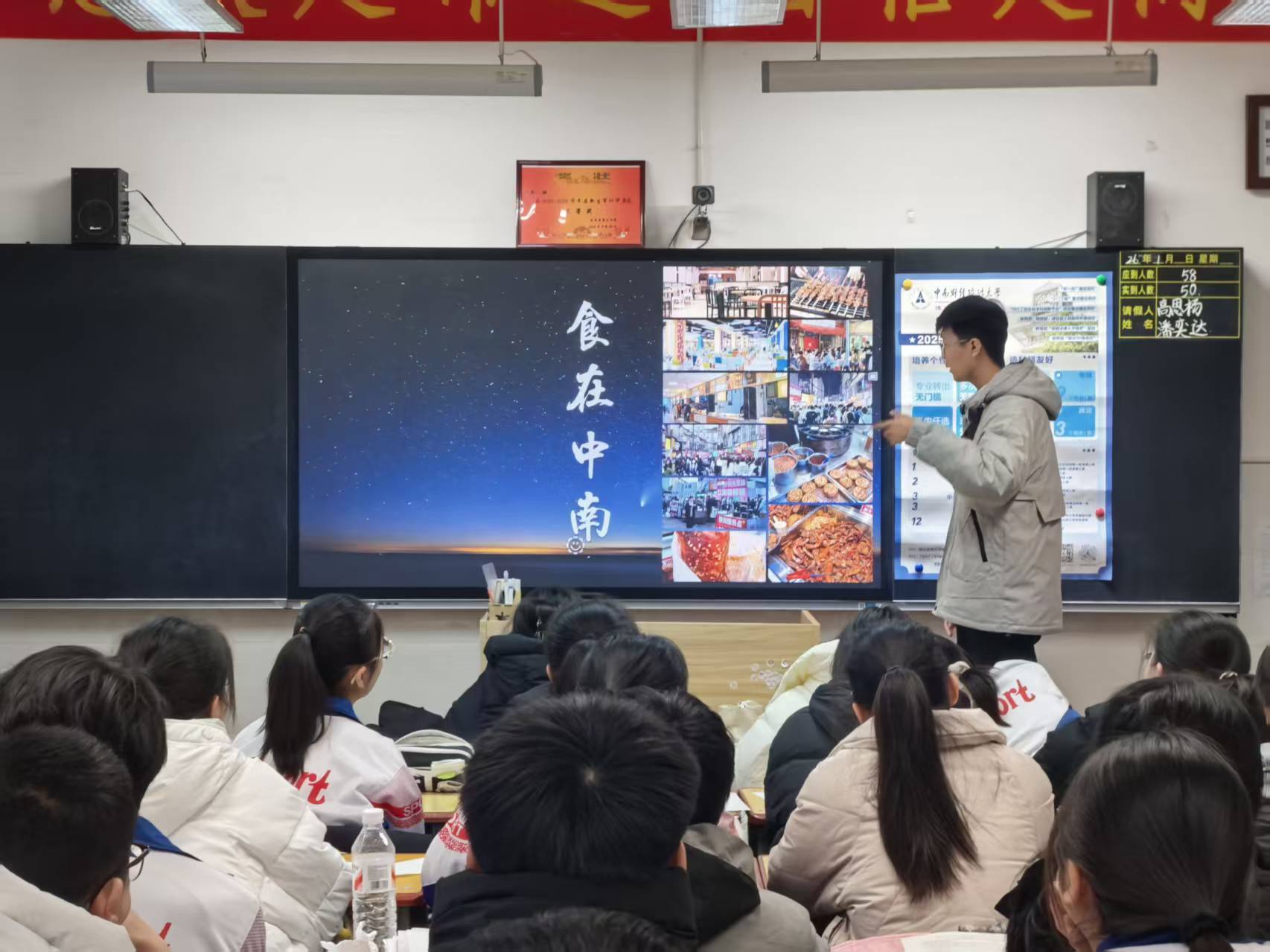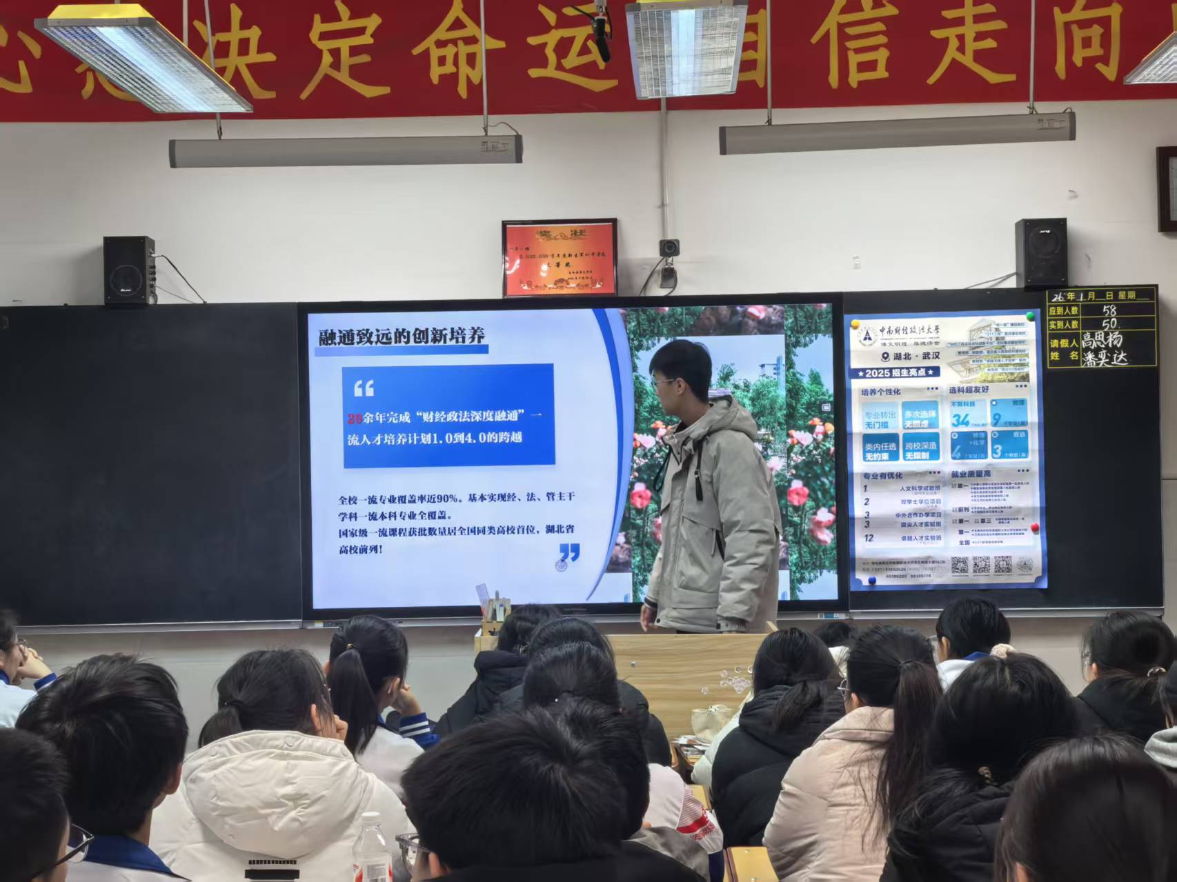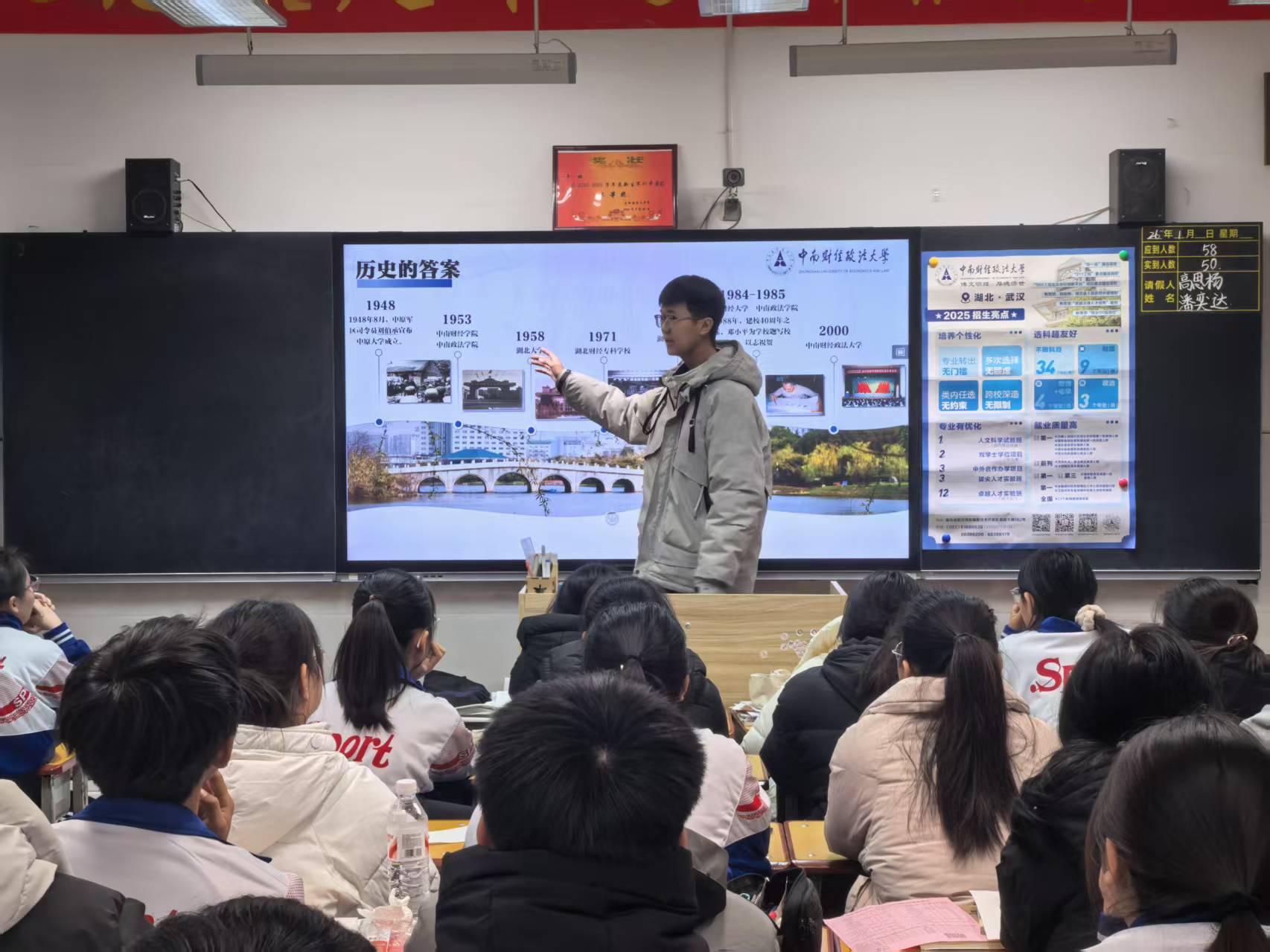 导语:2026年1月15日,由中南财经政法大学李想、王陈君组成的冰雪东北行团队积极响应学校宣讲活动,回到母校长岭三中,为学弟学妹介绍中南大,发放学校文创,展示了中南大的特色和优势,取得积极效果,使得吉林省长岭县范围内重点高中学子们对中南财经政法大学获得了更深的了解。