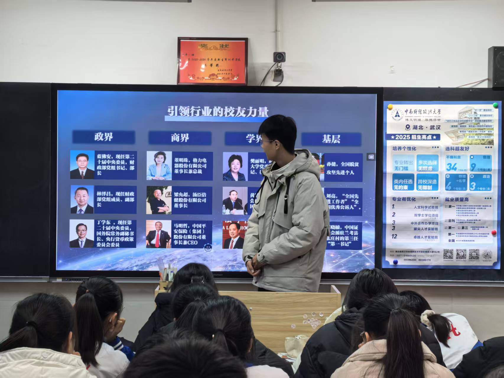 介绍完毕,当李想问到,谁愿意将中南财经政法大学作为自己高中时期的奋斗目标并为之努力时,看到举起的手和坚定的眼神,李想拿出了精心准备的文创礼包,激励他们不懈努力、顶峰相见,并留下了自己的联系方式,期待在中南大与他们相逢。