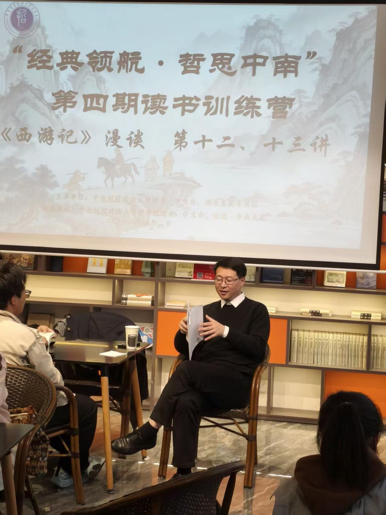 (学生通讯员:郑妍瑜/摄影:汪琪睿)4月2日下午,“经典领航·哲思中南”第四期读书训练营第十二、十三讲活动在我校南湖校区倍阅书店如期举行。湖北省新华书店倍阅高校校园文化服务平台运营总监王颖超老师作为主讲嘉宾,继续为营员们讲解吴承恩的著作《西游记》。本次课程主要讲授取经过程中“金角大王银角大王”和“乌鸡国”这两难设置的底层逻辑,为同学们深入剖析《西游记》故事设计背后不为人知的细节。