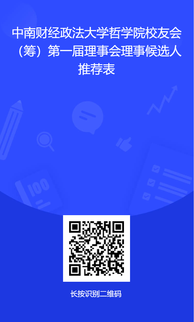 为凝聚四海校友之力,搭建思想共鸣、智慧共济、事业共进的平台,学院正式启动“中南财经政法大学哲学院校友会”筹建工作,并面向海内外广大校友,诚挚遴选第一届理事会理事候选人。我们期待寻找那些愿为校友联结“架一座桥”、为学科发展“燃一束光”的您。